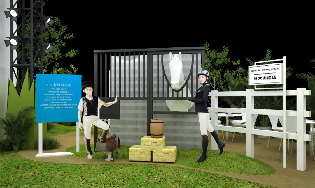飒学堂校服文化美学馆内,以中国知名学府为原型打造校园大门,用真实的校园情景铺就校园操场和校园大道,设立“音乐教室”、“艺术场景区”、“马术课堂”、“大剧场”等场景,真实还原教育现场;